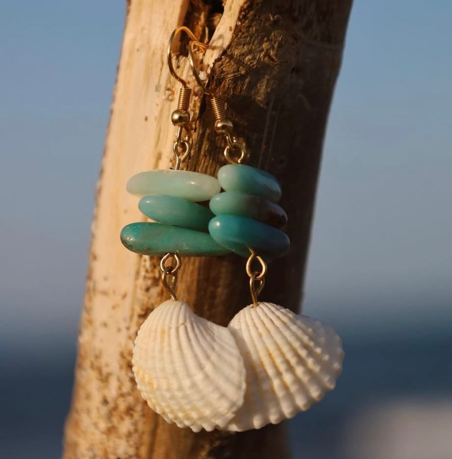 Pendientes artesanales con piedra Amazonita natural en tonos agua y conchas blancas. Un diseño ligero que evoca el vaivén del mar y la frescura de la brisa salada. Pensados para aportar luz, movimiento y una conexión serena con el océano.